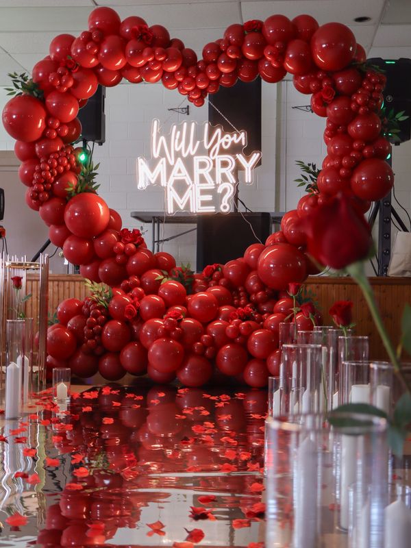 Step into a moment that feels like a dream come true. Our romantic proposal setup features a breathtaking heart-shaped balloon arrangement in rich, passionate red, framing the glowing “Will You Marry Me?” sign at its center. A mirrored aisle lined with flickering candles and scattered rose petals leads you to the love of your life, creating a picture-perfect path to forever. Every detail is designed to capture the magic, intimacy, and beauty of saying “yes” to a lifetime together.