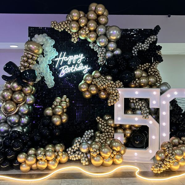 Includes a 2x7 Sequin wall (color of your choice), an LED sign, and Balloon Garland styled. Any Add on's available at an additional fee. Delivery fee not included.