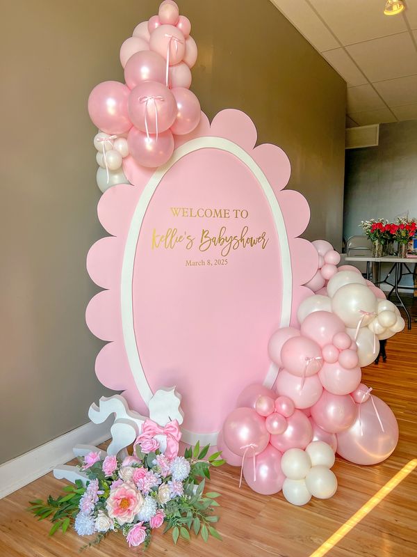 Greet your guests with our bubble frame wall customized to your event and styled with balloons and one of our smaller props. This is a perfect addition to a baby shower.