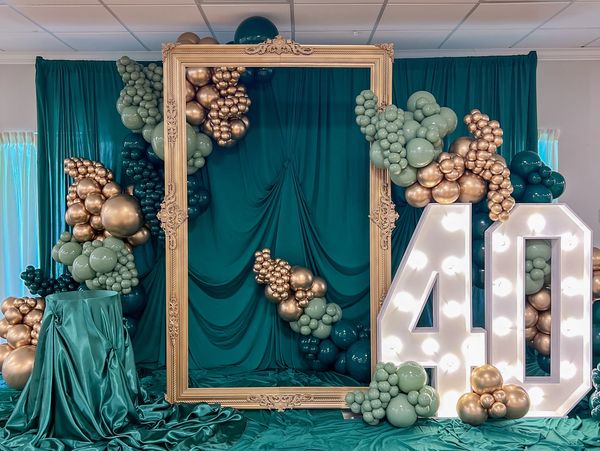 Feauturing our elegant Gold Frame with your choice of colored drapery or our Grass wall styled with Organic Balloon Garlands and 2 marquee numbers.