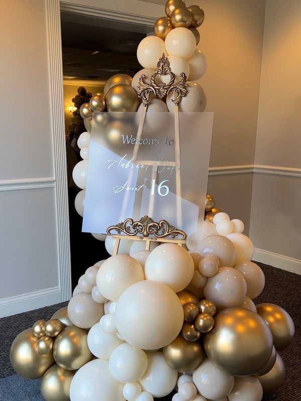 Create an unforgettable first impression for your event with our elegant gold easel styled with an acrylic custom sign and a custom balloon garland to greet your guests. A must add to your event package that you select.